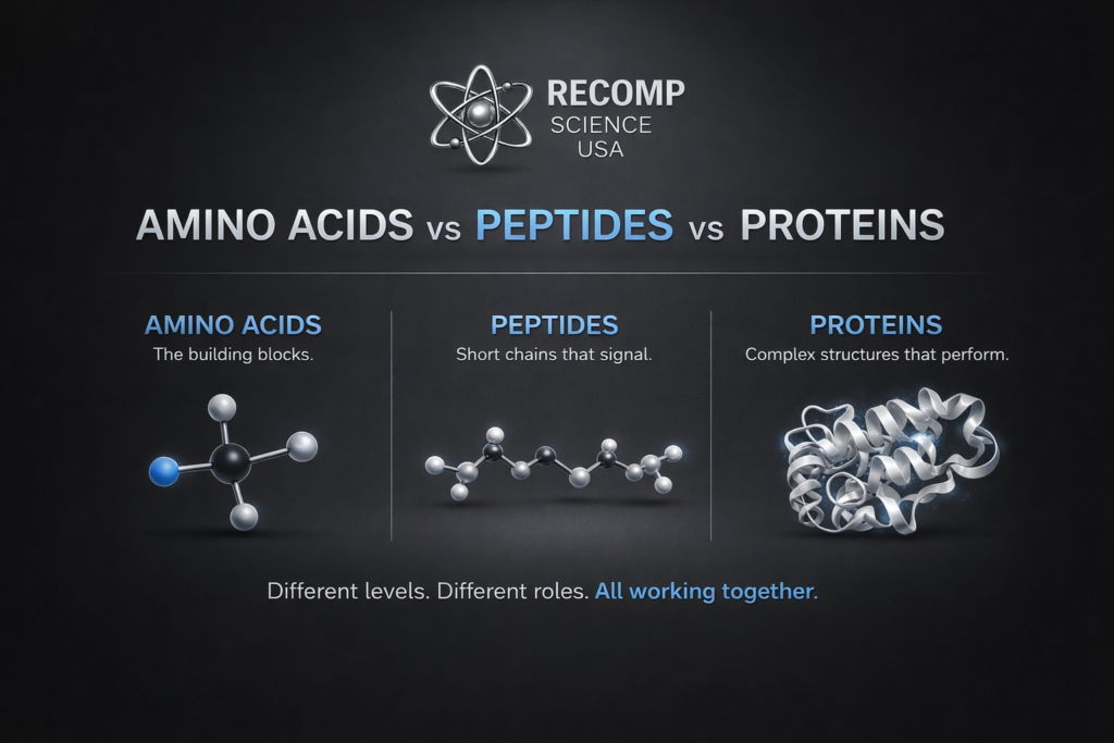 Amino acids, peptides, and proteins are closely related—but not the same. In this guide, we explain how these building blocks differ, how they connect, and why understanding the distinction matters when exploring nutrition, recovery, and general wellness.